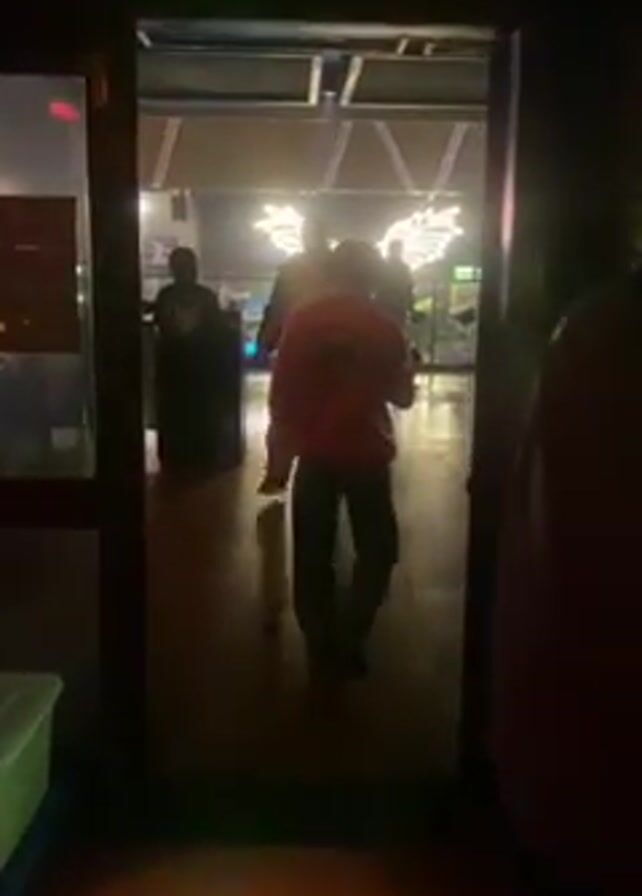 group of people walking through a doorway into a dimly lit arcade or entertainment space. Several individuals are visible, including one wearing a red sweater and green pants, and another in a tan shirt and pants. They are walking toward a lighted wall decoration that resembles angel wings. The entrance has a green exit sign and arrow on the floor, suggesting an escape route or direction. The overall atmosphere indicates an indoor entertainment setting, possibly a club or arcade with ambient lighting and decorations.