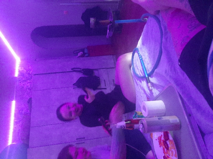 Two individuals are visible in a dimly lit room featuring purple LED lighting. One person is in the foreground with a bottle, while the other is standing behind them, both facing the camera. A table is in front of them, holding items such as a roll of toilet paper, a beer can, and a plate with some food. A hookah sits atop the table. A closet is visible in the background.
