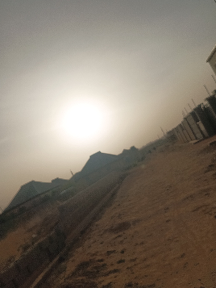 The sun is shining brightly on a dusty road lined with buildings. Some appear to be houses with green roofs, while others are under construction, showing concrete columns. The scene is hazy and slightly blurred, giving a sense of heat and distance. The landscape appears arid, with minimal visible vegetation.