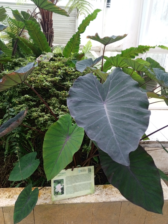 Lush foliage fills the scene, dominated by large, heart-shaped leaves of varying shades of green and gray. A sign with text and a flower photo sits at the base of one plant. Behind the leaves, a dense background of smaller, leafy plants adds depth. Light filters in from a window on the right, illuminating the scene. Ferns and other tropical plants add to the greenhouse atmosphere.