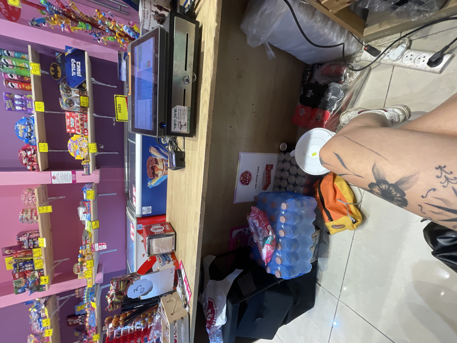 The image depicts the interior of a small retail establishment, identified as being located in Raanana, Israel, indicated by Hebrew text on signage and the prompt's instruction. The scene is captured from a slightly elevated, eye-level perspective looking towards a sales counter and back wall. In the foreground, the lower portion of two human legs, belonging to an individual positioned directly in front of the counter, are visible. The legs are extensively tattooed with black ink designs, including a large floral or butterfly motif on the left leg and linear patterns. The right foot wears a white sneaker with a red accent and a visible "NIKE" logo. The person appears to be seated or leaning. The primary subject is a wooden sales counter that spans the width of the frame. On the counter, from left to right, are a white wooden tray containing small items, a black marker pen, a small white container with red-tipped lollipops, and a red napkin dispenser with "Coca-Cola" branding in Hebrew. To the right, a black electronic Point of Sale (POS) system with a touchscreen display and an integrated cash drawer is present. A smaller black device with a blue indicator light is connected to the POS system. A sticker on the POS system reads "השווק הישיר" (The Direct Market). Behind the counter, the store's interior features bright pink walls. Three wooden shelves run horizontally along the back wall, displaying various packaged candies, snacks (including Pringles cans), small toys (some in Lego-branded boxes), and other retail items. Yellow price tags in Hebrew are affixed to the shelves. Above the rightmost shelf, a blue Batman-themed box is visible. Below the shelves, two chest freezers are positioned behind the counter. The freezer on the left is white, and the one on the right is blue with an ice cream graphic. A yellow sign above the freezers reads "סגור" (Closed). On the floor beneath the counter, from left to right, are a black bag or case, several shrink-wrapped packs of bottled water, a stack of silver beverage cans, an orange and yellow fabric bag, a white plastic lid, and a large clear plastic bag containing assorted items. To the far right, a white power strip is visible, plugged into an outlet, with several cables connected. A white sign with "Taste & Flavors" in English and Hebrew text, promoting miniature pastries, is affixed to the underside of the counter. The floor is tiled with light-colored, reflective squares. No direct actions or interactions are occurring.