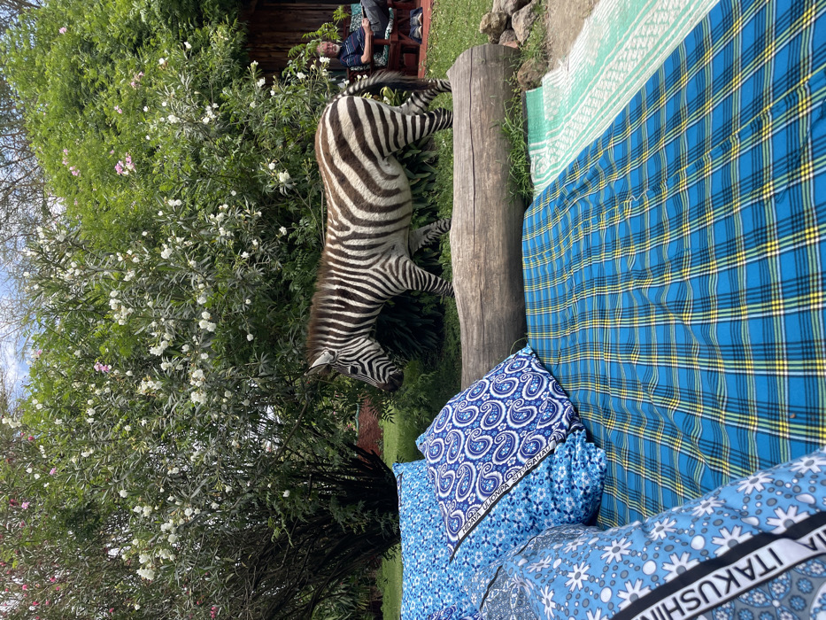The scene depicts an outdoor setting in Malewa West ward, Kenya. In the foreground, an improvised seating area is arranged. It features multiple blue cushions with white patterns, including paisley, floral, and geometric designs. One cushion has visible Swahili text: "HEDAYA ULITONIPA SITAISHISA" and "ITAKUSHINI." These cushions rest on a blue and yellow plaid fabric covering a flat surface. To the immediate right, a portion of a light green and white patterned fabric is visible. A large, horizontal wooden log separates this foreground area from the midground. In the midground, a single zebra, displaying characteristic black and white stripes, walks from left to right across a patch of green grass. The zebra's head is oriented towards the left. Behind the zebra and the log, a lush green environment consists of dense bushes and trees, featuring numerous white and scattered pink blossoms. In the background, to the right, a Caucasian male with a beard, wearing a striped blue shirt and dark pants, is seated in a wooden chair or bench. He is positioned slightly turned to the left, appearing relaxed. Adjacent to him is a rustic wooden structure, possibly part of a building. To the left, through the foliage, a distant structure with red bricks is faintly visible. The sky above is light blue with sparse cloud cover.