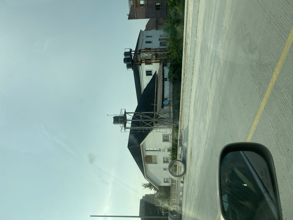 The scene depicts a daytime urban street view in Alaguntan, Nigeria, observed from a vehicle. The foreground features a light grey concrete road with linear grooves and a single yellow painted line along its center. A black side-view mirror, reflecting a partial vehicle interior and an indistinct occupant, is visible on the lower left. Adjacent to the road, separated by a light grey concrete curb, are two large, circular concrete culvert sections resting horizontally on unpaved ground. Beyond these, green foliage lines the middle ground. The background consists of multiple residential structures. Prominently, a two-story white building with a dark hip roof is on the left, featuring multiple windows and a second-story balcony. Adjacent to this building stands a metal-framed water tower supporting a single dark cylindrical tank, with a ladder visible. Further right, another white two-story building is visible, alongside a second metal-framed tower supporting three smaller dark cylindrical tanks. A brown multi-story building is partially visible on the far right. A blue satellite dish is visible near the base of the first water tower. A tall, thin pole is present on the far left. The sky is clear and light blue with a faint vapor trail in the upper left quadrant. No active human figures are clearly visible in the external environment.