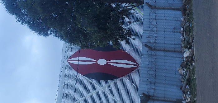 A modern building is adorned with a large, stylized Maasai shield emblem in the center. The shield is colored with maroon, black, and white markings. The building has a vertically striped facade. A green tree obscures the upper portion of the building. A cyclone wire fence with visible trash is on the right edge of the photo. The image appears to be taken during the day, and the photo is rotated.