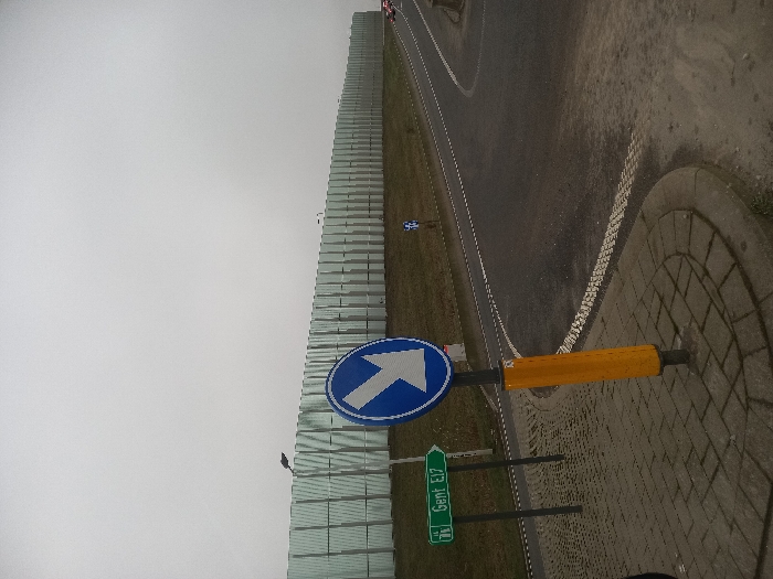 The image displays an exterior road scene in Burcht, Belgium, under a uniformly overcast sky. In the immediate foreground, a patterned grey paver sidewalk features a blue circular mandatory sign with a white arrow pointing diagonally right, mounted on a pole encased in a yellow protective sleeve. Adjacent to it, a green rectangular road sign with white text reads "Gent E17" and includes a left-pointing arrow. An asphalt road, marked with white solid and textured dashed lines, curves from the left foreground towards the right mid-ground. To the right of the road, an ascending grassy embankment precedes a lengthy, segmented sound barrier constructed from translucent or reflective panels, which stretches horizontally across the mid-ground. A smaller blue circular mandatory sign, similar to the foreground one, is visible further down the embankment beside the sound barrier. Faint red lights, consistent with vehicle taillights, are discernible in the far distance on the road. No individuals or active interactions are depicted within the frame.