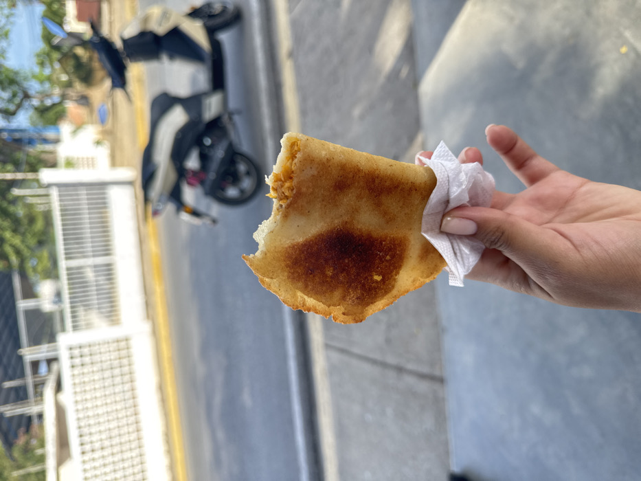 The image presents a daytime street scene in Altagracia, Venezuela. In the immediate foreground, a left hand, displaying light pink manicured fingernails, holds a partially consumed, golden-brown fried pastry, likely an empanada, wrapped in a crumpled white paper napkin. A bite has been taken from the upper-left edge of the pastry, revealing an orange-brown, textured filling. The pastry exhibits darker, fried areas on its surface. The background is out of focus, depicting a paved road or sidewalk with a yellow painted line. Further back, a two-toned white and black scooter is parked or stationary on the side of the road. Behind the scooter, a white fence with a rectangular grid pattern is visible, topped by green tree foliage. The sky above is light blue.