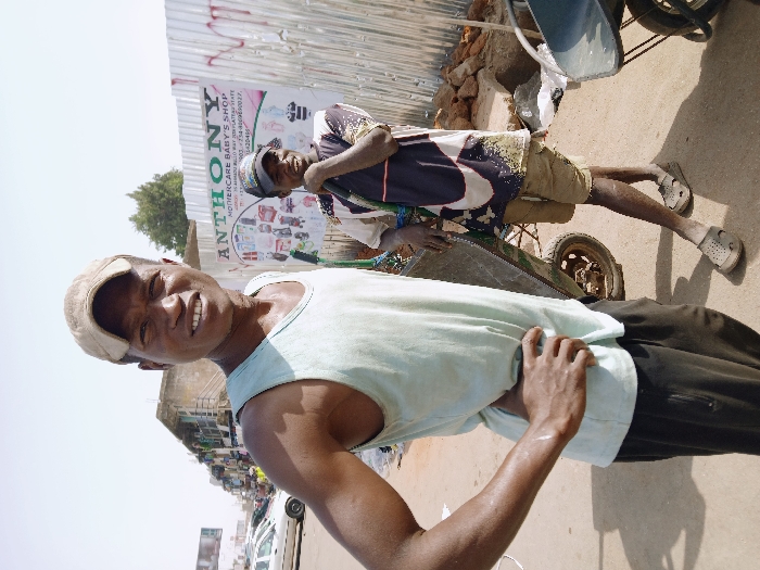 This image depicts an outdoor, brightly lit street scene in Mumbwa, Zambia. Two adult dark-skinned males are positioned in the foreground. The man on the left stands facing forward, looking directly at the camera with a slight smile. He wears a light-colored (possibly pale blue or green) tank top, dark trousers, and a light brown baseball cap. His left hand rests on his hip, and perspiration is visible on his arm and neck. The man on the right stands slightly behind and to the right of the first man, leaning on a pushcart. He wears a multi-colored, patterned t-shirt, light brown shorts, and a dark baseball cap. He is looking towards the right side of the frame with a slight smile, his right hand near his chin. He wears light-colored sandals. Between the two men is a pushcart or wheelbarrow, with another partially visible on the far right. Behind the man on the right is a corrugated metal fence serving as a backdrop. Affixed to this fence is a white sign with green lettering, advertising "ANTHONY MOTHERCARE BABY'S SHOP," featuring images of baby products and contact information, including a phone number beginning with "+234". To the left, in the background, a street is visible with parked vehicles, including a white sedan, and multi-story buildings. Further in the distance, a billboard structure is discernible. The ground is unpaved and appears dusty, with some rubble near the base of the corrugated fence. Green foliage from trees is visible above the background structures. The scene suggests a commercial or market area under clear daylight.