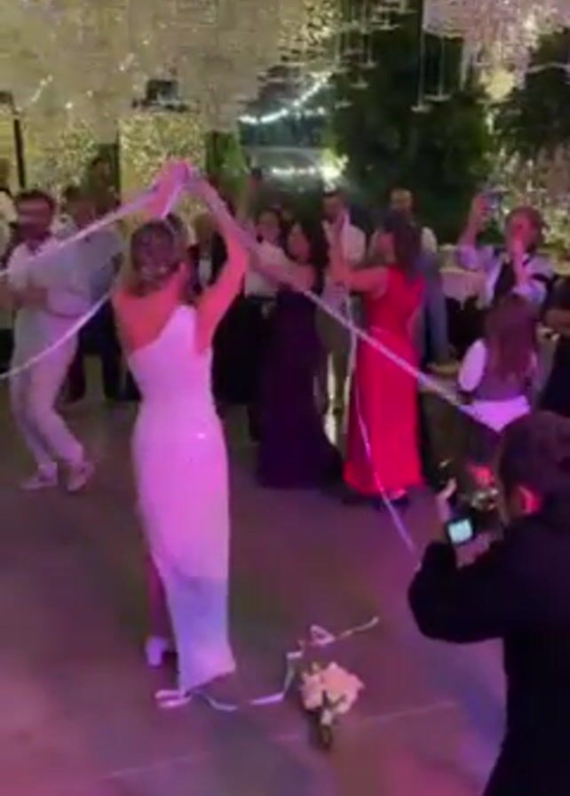 group of people at a wedding. A woman in a white dress is standing in the center, holding ribbons in her hands with other women. There are several people around them, some holding up their hands with ribbons. In the background, there are men and women watching, some are filming. A photographer is visible in the foreground, taking pictures. The setting is a dance floor with what appears to be light fixtures above. A white bouquet is on the floor near the bride.