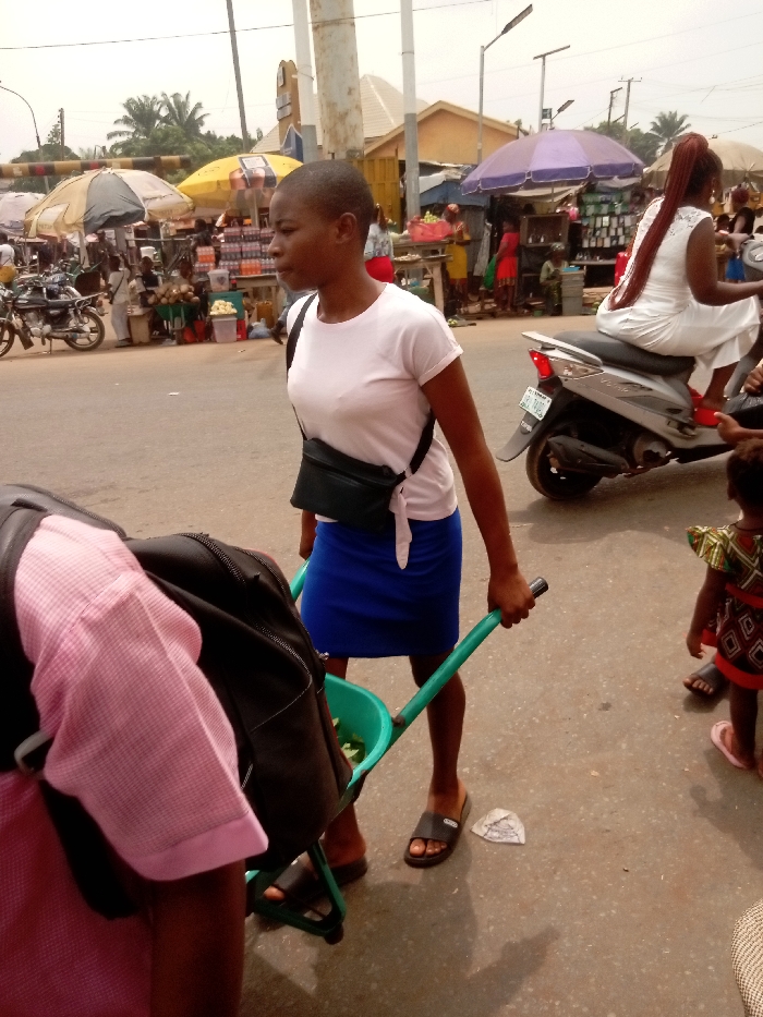 This image depicts a bustling street scene in Umudioka, Nigeria. In the mid-ground, a young woman with a short buzz cut wears a white t-shirt, a blue skirt, and dark slides, with a black fanny pack secured across her chest. She pushes a small, green wheeled cart containing light green objects in its basin. Her lower body is partially obscured by a dark backpack with a pink checkered shirt draped over it, positioned in the immediate foreground on the left. To her right, a small child in a colorful patterned dress and pink sandals stands on the paved road. Further right, a woman in a white dress and red shoes, with long reddish-brown braided hair pulled into a high ponytail, sits on a silver scooter displaying a Nigerian license plate. The background reveals a vibrant street market with multiple vendors operating under assorted umbrellas (tan and purple), selling various goods including packaged drinks and produce. Utility poles, overhead wires, and streetlights are visible, along with distant buildings and tropical foliage. The ground is a paved road surface with minor debris.