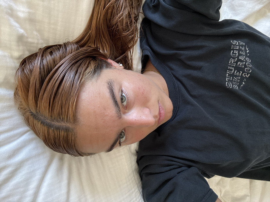 The image displays a close-up, inverted portrait of an individual, likely female, lying supine. The subject has medium-length, wet, light brown hair with darker roots and lighter highlights, which is spread across a white, textured bedsheet. The individual is wearing a dark-colored, long-sleeved top with distressed white text on the chest reading "STURGIS BIKE RALLY 2008". A single white, spherical earring is visible in the subject's right earlobe. The subject's face is turned towards the camera, featuring light skin, prominent eyebrows, and green/hazel eyes. No specific location within San Diego, United States of America, can be determined from the visual evidence. The scene appears to be an indoor setting.