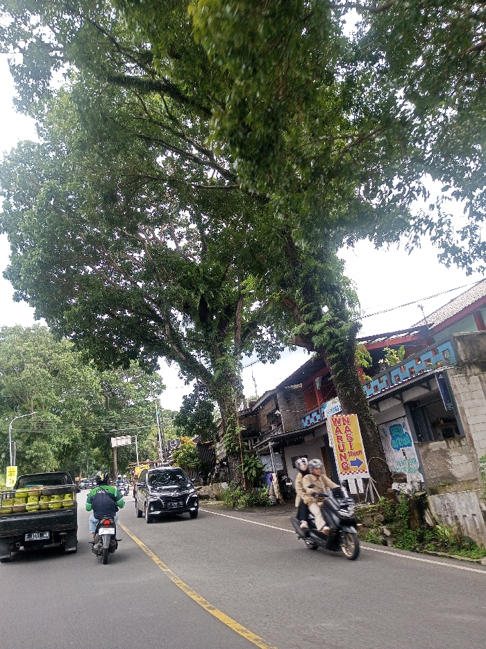 A street scene shows vehicles including a pickup truck loaded with gas canisters, a black SUV, and several scooters moving along a paved road with a yellow lane divider. Lush green trees overhang the road, partially obscuring buildings on the side. A sign with "WARUNG" in bold letters is visible. Two individuals on a scooter wear helmets and beige jackets. The sky is overcast.