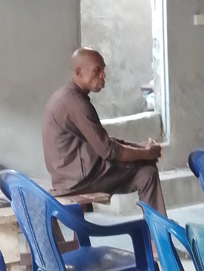 An adult male, bald or closely shaven, is depicted sitting in profile, facing right, within an indoor setting in the city of Unknown, Unknown. He wears a dark brown long-sleeved top and matching trousers. His hands are clasped or interlocked and rest in front of him. He is seated on a low, light-colored wooden bench or stool. The background consists of rough, light gray concrete or stucco walls. To the right of the subject, an open doorway or archway reveals a darker, less defined area beyond, with some indistinct items on a lower ledge. The foreground shows parts of two blue plastic chairs. The environment appears utilitarian, with natural lighting illuminating the scene. No direct interaction is visible.