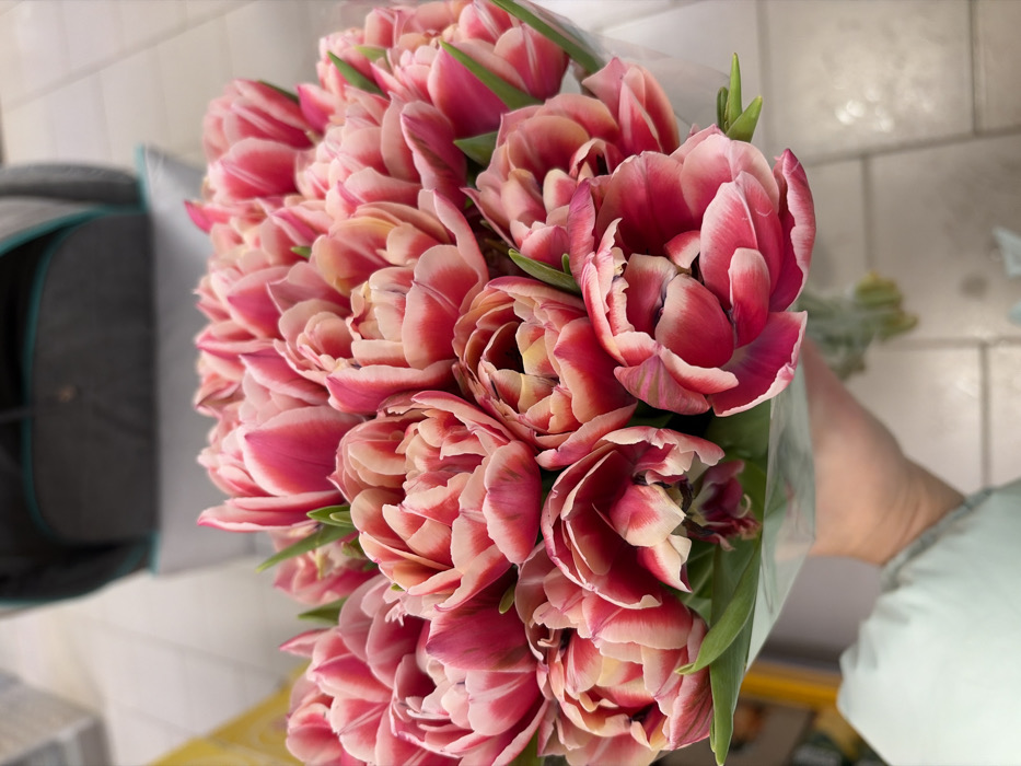 - "A close-up, eye-level photograph captures a large bouquet of approximately 30-40 multi-petaled tulips held by a person" by FM-82K7o1, licensed under CC BY 4.0