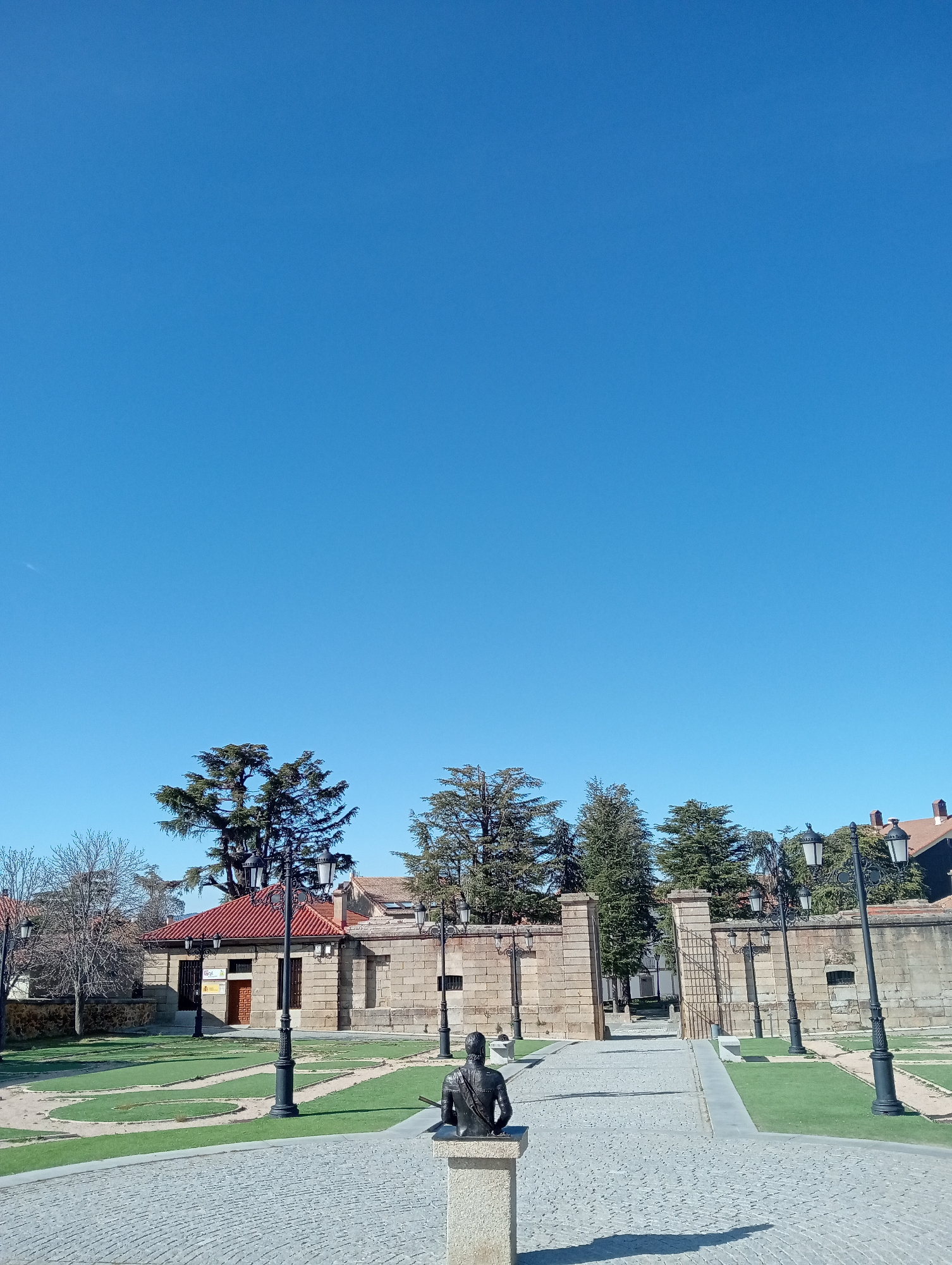 The image depicts a static outdoor scene in Piedrahíta, Spain, under a clear, bright blue sky. A bronze bust of a figure, viewed from behind, sits atop a light-colored stone pedestal in the immediate foreground, casting a shadow onto the cobblestone path it faces. This path extends centrally and slightly to the right, composed of small, light-grey paving stones. To the left and right of the central path are manicured lawns interspersed with curved pathways of dirt or gravel. Several black, ornate streetlights, each featuring multiple lanterns, are symmetrically placed along these pathways and the main cobblestone route. In the midground, on the left, stands a stone building with a prominent terracotta tiled roof, a wooden door, and two visible signs. Bare-branched deciduous trees are visible further left, behind a low stone wall. In the midground, stretching from center-left to right, is a substantial stone wall, likely part of an older edifice, which features a prominent arched gateway with a metal gate structure in the center. Beyond these structures, in the background, additional buildings with terracotta roofs and dense green coniferous trees are visible. The overall scene is devoid of human presence or overt action, characterized by architectural and natural elements under strong daylight illumination.