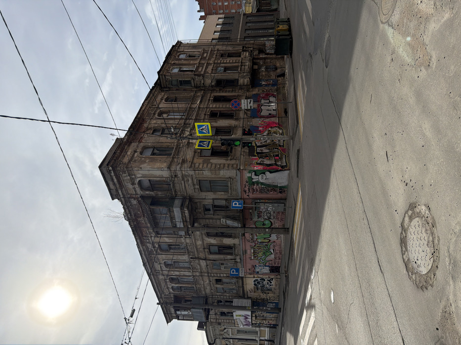 An overhead view captures a street intersection in Rostov-on-Don, Russia, under an overcast sky with a hazy sun visible in the upper left. The focal point is a three-story, dilapidated corner building with classical architectural elements, including ornate window frames and cornices, exhibiting extensive peeling plaster, visible brickwork, and rust stains. A small sapling grows from the building's rooftop. The ground floor of the building is heavily covered in multi-colored graffiti tags and stylized figures, predominantly in pink, green, black, and white. Two aged, metal-framed balconies protrude from the upper floors. On the building's facade, two blue "P" parking signs are affixed. Near the corner, two yellow square pedestrian crossing signs with black pedestrian symbols are suspended above the intersection. A traffic light displays a green signal, and a red circular sign indicating "no stopping" for trucks with specific time restrictions is visible on a pole. Numerous black utility wires crisscross the frame against the sky. The asphalt road at the intersection shows signs of wear, cracks, and patches. Two marked pedestrian zebra crossings are present. In the foreground, a circular metal manhole cover is embedded in the asphalt. On the sidewalk to the right of the building, two dark green industrial-style trash bins are positioned. No individuals or vehicles are present in the immediate vicinity. Shadows are cast across parts of the street by the structures and overhead light.