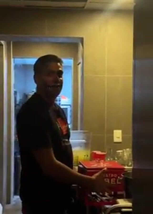A man stands in a commercial kitchen, holding a case of Maestro Dobel tequila. He is facing the camera and smiles, holding up a peace sign with his right hand. He wears a black t-shirt and his face appears to be painted with a design. Behind him, there's a doorway to what appears to be a dishwashing area with stacks of dishes and a trash can. There is an open container with a yellow liquid on the counter next to him. The kitchen walls are covered with neutral-colored tiles. Overhead, the ceiling has exposed grid sections. The lighting is bright and artificial. He laughs as music plays.