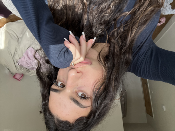 The image depicts a close-up, indoor self-portrait of a female individual. She has long, dark, wavy hair, brown eyes, dark eyebrows, and visible freckles across her nose and cheeks. She is wearing a dark blue, long-sleeved, ribbed top. Her left hand is raised towards her face, with the thumb touching the area beneath her lower lip, and a ring is visible on her thumb. Her nails are long and manicured with white tips. Her lips are slightly pursed, and her gaze is directed towards the camera. Strong natural sunlight enters from the right side of the frame, illuminating her and casting shadows. The background to the left features a light-colored wall with a partial view of a light brown wooden door equipped with a dark circular doorknob. To the right, a rumpled bed with light-colored bedding is visible, upon which a pink garment and another light-colored item rest. The specific location within Vancouver, Canada, cannot be ascertained from the visual information provided in the image.