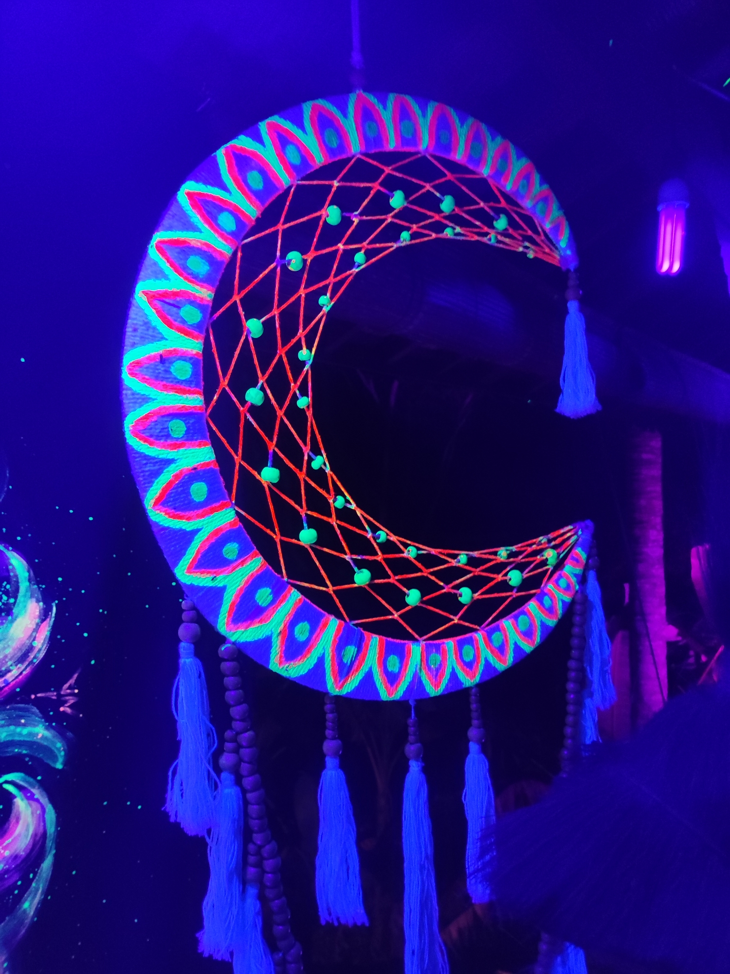 An indoor scene in Lokaserena, Indonesia, is illuminated by ultraviolet light, casting a dominant dark blue-black hue. Centrally positioned is a large, crescent moon-shaped decorative object, approximately 80-100 cm in height, oriented with its points angled upwards to the left. The object's outer frame features a repeating pattern of fluorescent neon pink and neon green teardrop-like designs. Its interior void is spanned by a network of interwoven neon orange threads, forming an irregular web, punctuated by multiple small, spherical, fluorescent neon green beads. Hanging from the lower curve of the crescent are several strands of pale blue fibrous tassels, some interspersed with dark, spherical beads. In the upper right quadrant, a vertical, purple-pink fluorescent tube light, approximately 30 cm long, is visible. The dark background wall on the left displays a partially visible, abstract artwork, glowing with neon green speckles and purple swirls. A dark, vertical object, possibly a plant trunk, is dimly visible in the mid-right background. No individuals or active events are depicted.