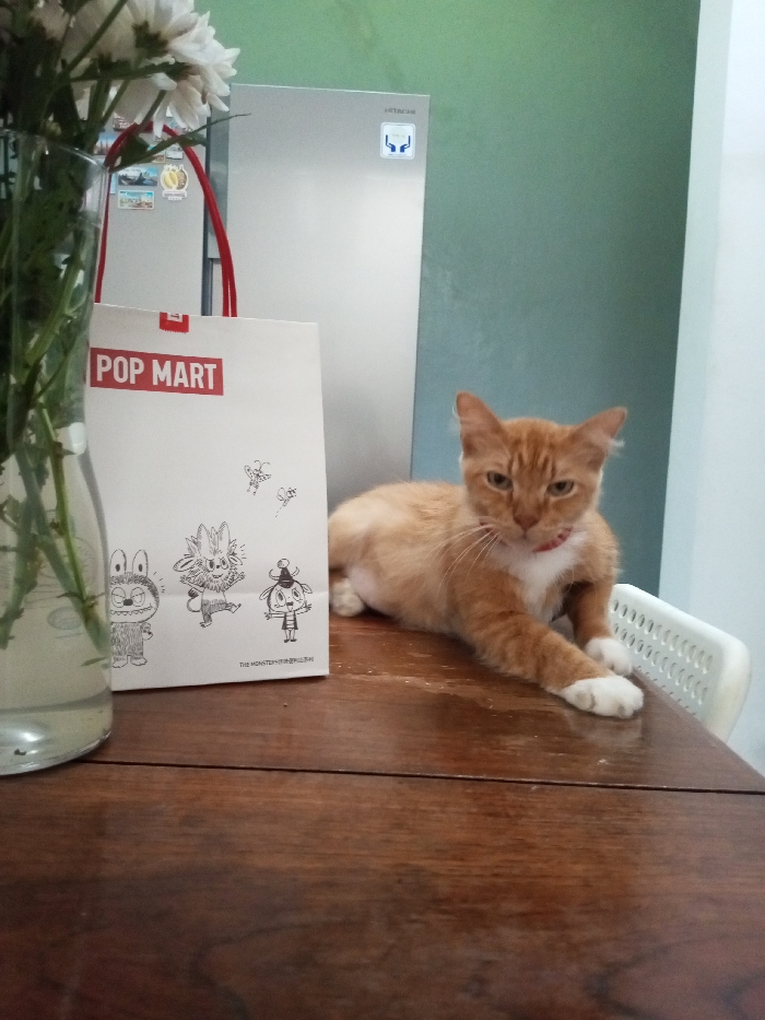 An orange cat with white paws and a red collar rests on a wooden table. Beside the cat is a white Pop Mart shopping bag with red handles and cartoon illustrations. A glass vase filled with white flowers sits on the left edge of the table. In the background is a silver refrigerator against a green wall, adjacent to a white wall. A white plastic chair is partially visible behind the cat.