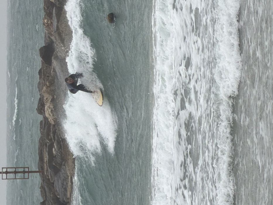 - "A male individual in a dark wetsuit is captured riding a breaking wave on a light-colored surfboard, positioned in a crouched stance, generating white foam and spray" by FM-grnl23, licensed under CC BY 4.0