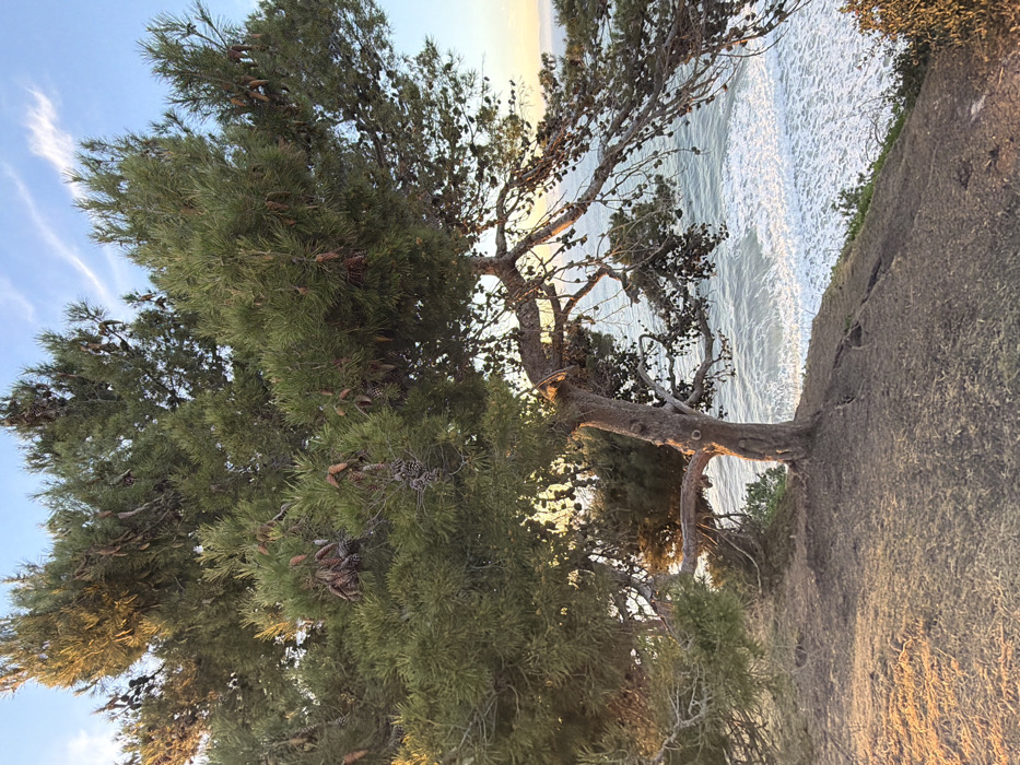 A pine tree, heavy with cones, grows horizontally from a cliff edge. The trunk bends seaward, its branches reaching towards the ocean, partially obscuring the waves. A concrete barrier forms the cliff's edge, its surface textured and sunlit. The sky transitions from blue to light grey, with a faint cloud streak. The overall composition is tilted, presenting a skewed perspective of the scene.