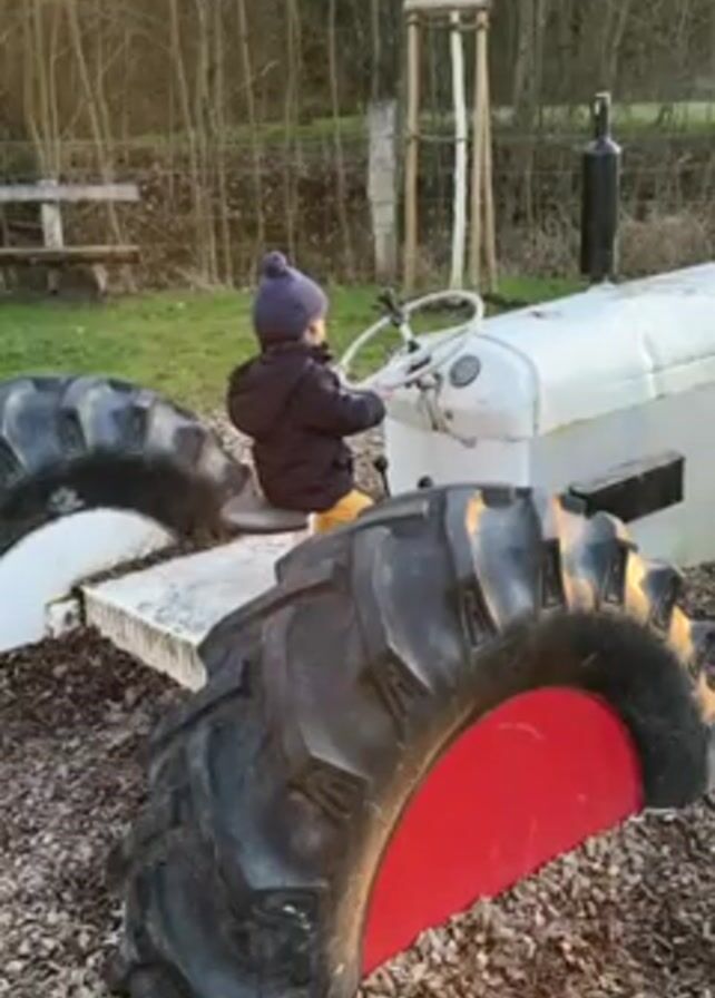 A young child, facing away from the camera, sits on a gray tractor, which appears to be a playground structure