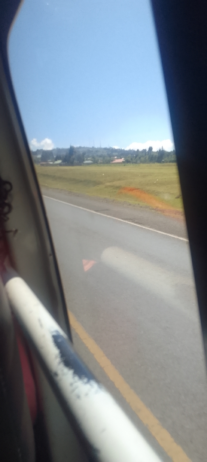 The scene depicts an exterior view observed from within a vehicle, located in Naivasha East ward, Kenya, during daylight hours under a clear blue sky with sparse white cumulus clouds. The foreground shows a partial dark window frame on the left and a white, partially chipped metal rail extending diagonally from the bottom-left towards the center. The mid-ground features an asphalt road with a solid yellow line along its right edge, displaying an inverted orange triangular marking and an elongated light-colored reflection on its surface. Adjacent to the road is a green-yellow grassy verge, which includes a distinct patch of reddish-brown earth. In the background, scattered buildings, some with red roofs, are visible amidst trees on elevated terrain, with further distant structures, possibly communication towers, silhouetted against the sky. No individuals or direct interactions are visible.