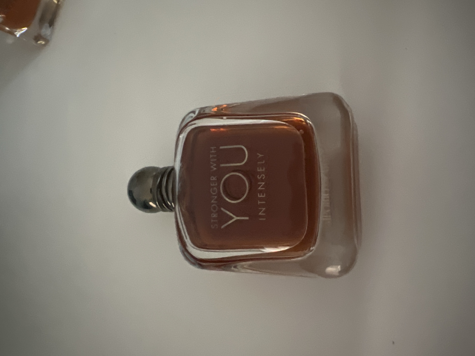 A glass bottle of perfume, "Stronger With You Intensely," is on a white surface