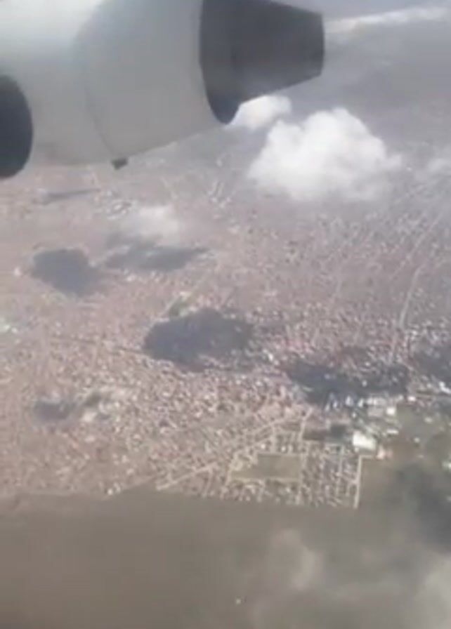 view from an airplane window during descent. A section of the plane's engine is visible in the upper left corner. Below, a sprawling urban area stretches out, with densely packed buildings and roads. There are clouds and shadows cast across the city. The window frame is also visible. Audio can be heard of someone making an announcement.