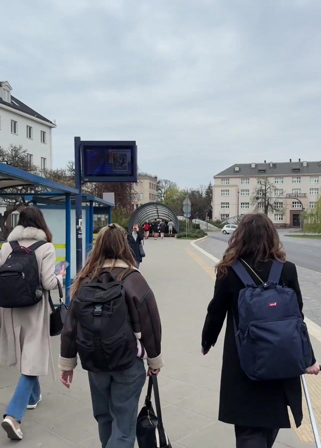 - "Three young women walk along a sidewalk near a bus stop with a digital display and an arched entrance to an underground passage, possibly a train station" by FM-8ywoA2, licensed under CC BY 4.0