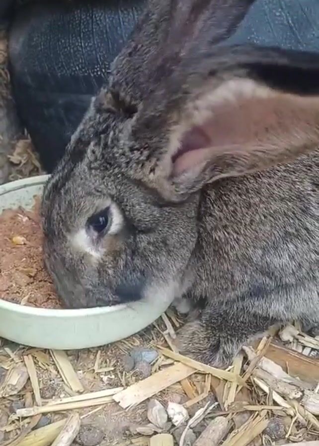 - "A gray rabbit is shown in close-up, eating from a light-green dish" by FM-ie9cp2, licensed under CC BY 4.0