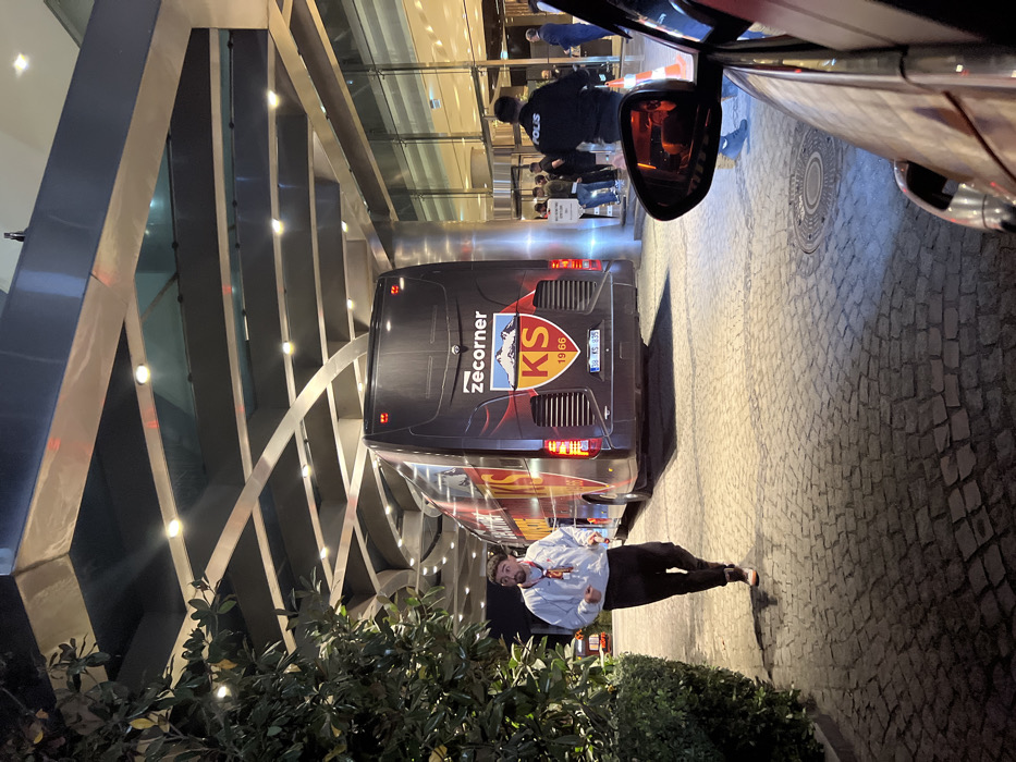 This image depicts an outdoor scene at the illuminated entrance of a modern building, likely a hotel, in Bağcılar, Turkey, observed during nighttime. In the midground, a dark-colored coach bus, bearing "Zecorner" branding and a "KS 1966" logo with a red and yellow crest on its rear, is positioned facing the building entrance. Its license plate, "38 KS 835," is clearly visible. The bus features red and yellow graphic accents along its side. To the left of the bus, a male individual with a beard, wearing a light-colored long-sleeved top (possibly a white sweatshirt), dark trousers, and light-colored sneakers, is captured in motion, moving from right to left across the cobblestone pavement. He appears to be jogging or walking briskly. In the background, behind the bus, the brightly lit glass facade and entrance of the building are visible. A male individual in a dark uniform with "POLIS" emblazoned on his back stands facing the entrance, accompanied by several other indistinct figures congregated near the automatic glass doors. The entrance is covered by a geometrically structured canopy with numerous embedded downlights. In the immediate foreground, to the right, the front-right section of a red vehicle is visible, including a portion of its fender, headlight, and side mirror, from which the photograph appears to have been taken. Two orange traffic cones are situated near this vehicle, one partially reflected in the side mirror. Green foliage is visible on the far left, bordering the cobblestone path.