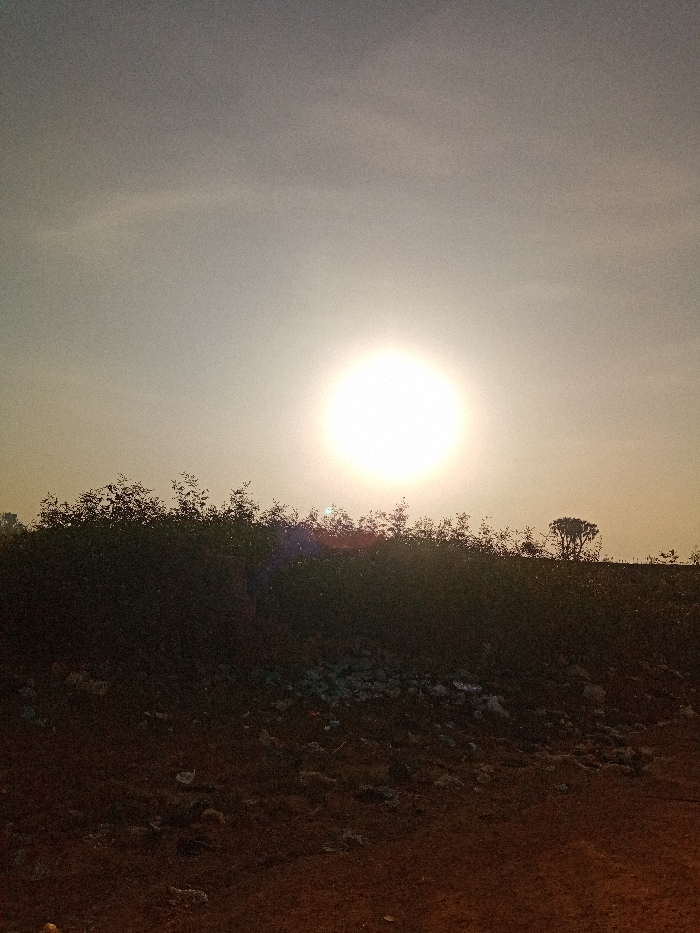 The image depicts an outdoor scene in Dabawa, Nigeria, characterized by direct backlight during either sunrise or sunset. The upper half of the frame shows a hazy, light grey sky with the sun appearing as a bright, white, circular orb positioned slightly above and to the right of the image center. A prominent horizontal band of dark, dense foliage, likely bushes or small trees, occupies the mid-ground, silhouetted against the luminous sky. A lens flare is visible as a reddish-purple streak emanating from the sun and extending into the foliage. In the far right background, a single, distinct tree is silhouetted against the lighter sky. The foreground consists of dark, uneven reddish-brown earth with scattered debris, including what appears to be rocks and trash. No people, animals, or specific actions are discernible.