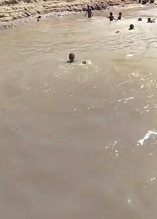 Several children are swimming in a muddy body of water. The water is mostly still, but there are ripples created by the swimmers. The banks of the water source are a beige, sandy dirt. The day is sunny.