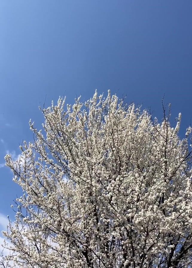 tree full of white blossoms against a bright blue sky with a few small white clouds