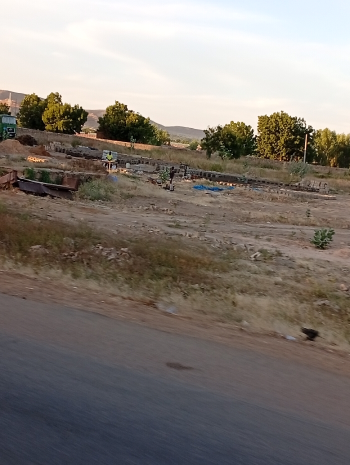 A slightly blurred landscape features a field with rows of concrete blocks and a few trees scattered around. A man stands among the blocks, possibly working. A truck is partially visible to the left, and hills are silhouetted in the background under a hazy sky. The foreground is dominated by an asphalt road in motion. The scene suggests a construction or industrial activity in a rural or semi-rural setting.