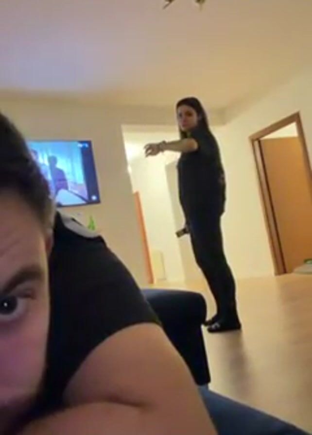 A man is lying down on a blue cushion with his head propped up. He is looking directly at the camera with one eye clearly visible. He has dark hair and a beard. Behind him, a woman with long, dark hair stands in the middle of the living room. She is wearing a black t-shirt and black leggings. She gestures with her right hand towards her wrist, as if checking the time. The living room has wooden floors, a television on the wall, and a light fixture on the ceiling. There are doorways leading to other rooms in the background. The woman places her hands on her hips and stands up straight.
