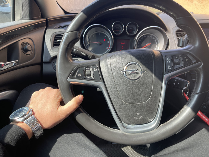 The scene depicts the interior of a vehicle, specifically from the driver's perspective in the city of Lesidren, Bulgaria. A person's right hand, adorned with a metallic link-bracelet wristwatch on the left wrist, is gripping the lower left portion of a black leather-wrapped steering wheel. A small green indicator light is illuminated on the steering wheel's lower left spoke. The steering wheel features a central Opel logo, "AIRBAG" text, and multifunction controls on both sides. A car key with a red "REMOVE BEFORE FLIGHT" fabric keychain is partially visible, hanging near the steering column. Visible through the steering wheel is the instrument cluster, displaying a digital speed reading of "0" and corresponding analog needles at zero for both speed and engine RPM. Portions of the dark-colored dashboard and driver's side door panel, including a chrome door handle and a control knob, are also visible. Sunlight illuminates the interior, casting defined shadows. The background outside the windshield is out of focus, suggesting an outdoor daytime setting.
