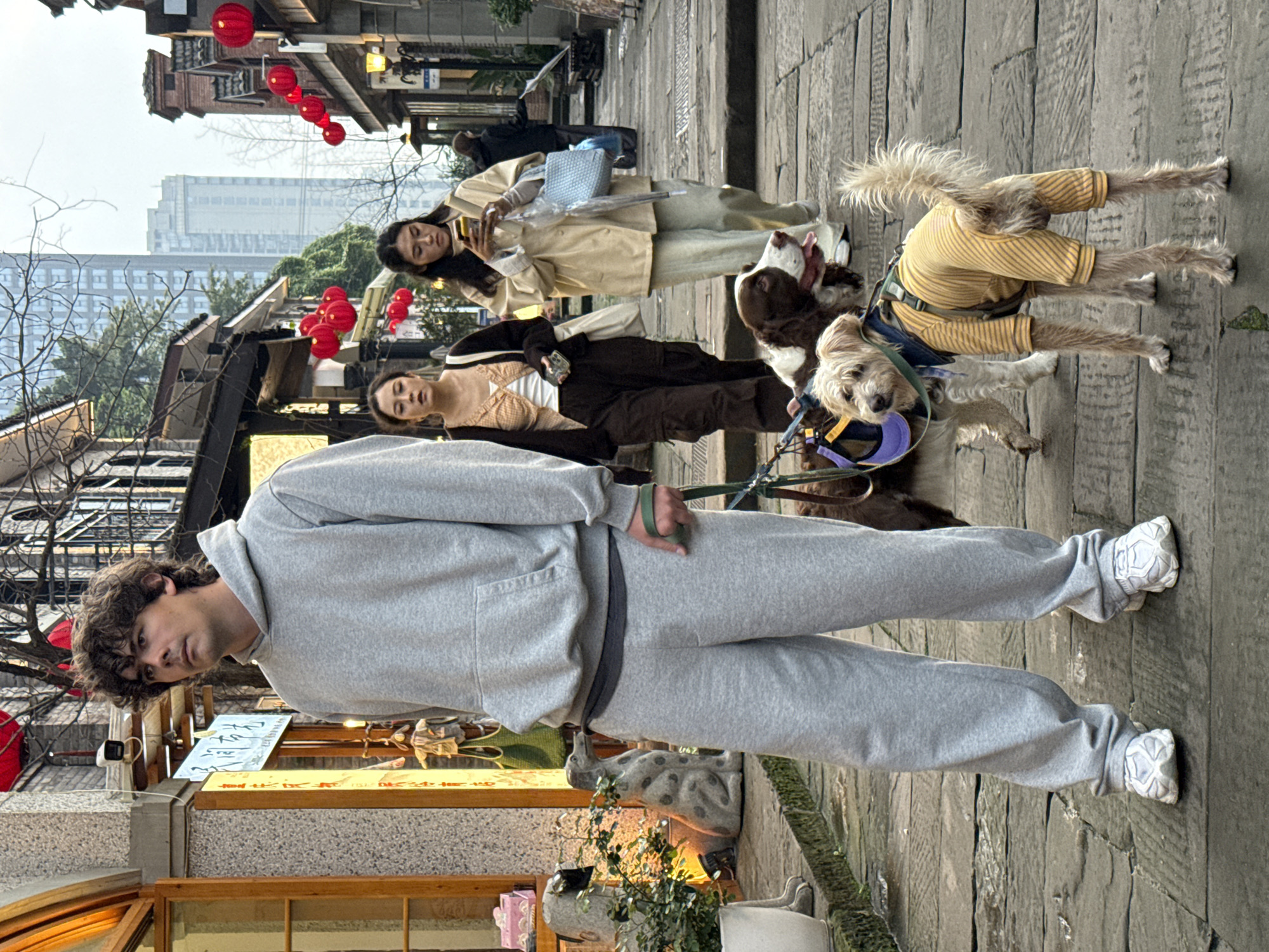 The image depicts an outdoor street scene in Nan'an District, China. The paved street features large, uneven stone slabs. In the foreground, a young adult male with dark, curly hair stands facing slightly right, looking into the distance with a neutral expression. He wears a grey hooded sweatshirt, matching grey sweatpants, and white athletic shoes. His left hand holds a green leash. To his right, a small, shaggy-haired dog, possibly a terrier mix, wears a yellow and white striped full-body jumpsuit and a harness with a green leash; it stands facing right but looks back towards the camera. Behind this dog, partially obscured, is a medium-sized dog with white and brown fur, possibly a Springer Spaniel, wearing a blue and yellow harness, appearing to walk forward with its tongue slightly out. In the midground, two young adult females walk along the street from left to right. The female on the left wears a light-colored top under an open dark cardigan and dark cargo pants, carrying a light tote bag and a smartphone. The female on the right wears a light-colored long-sleeved jacket over a striped top and light-colored wide-leg pants, holding a light blue woven bag and actively looking down at a smartphone held in both hands. The street is lined with buildings exhibiting a mix of traditional Chinese architectural elements, including tiled roofs, wooden window frames, stone facades, and red lanterns strung overhead and hanging from eaves. Shopfronts with display windows are visible on the left, along with decorative stone dog statues and potted plants. A white security camera is mounted above the foreground male's head on a building column. In the distant background, modern high-rise buildings are visible against an overcast sky. A partially obscured figure in dark clothing is visible further down the street on the right.