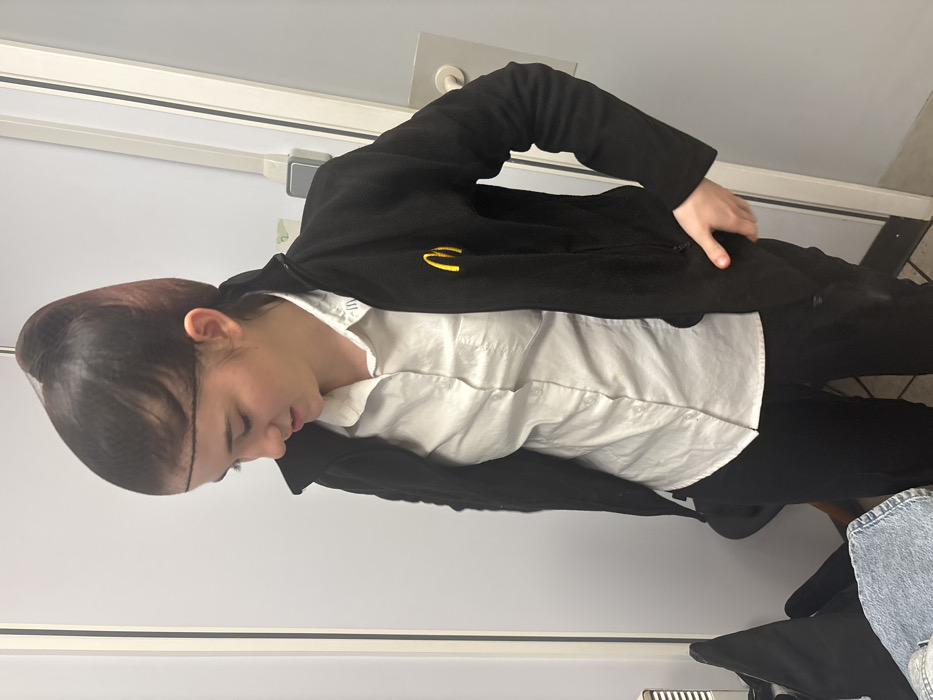 A young woman wearing a black zip-up jacket with a yellow logo, a white button-down shirt, and black pants is depicted