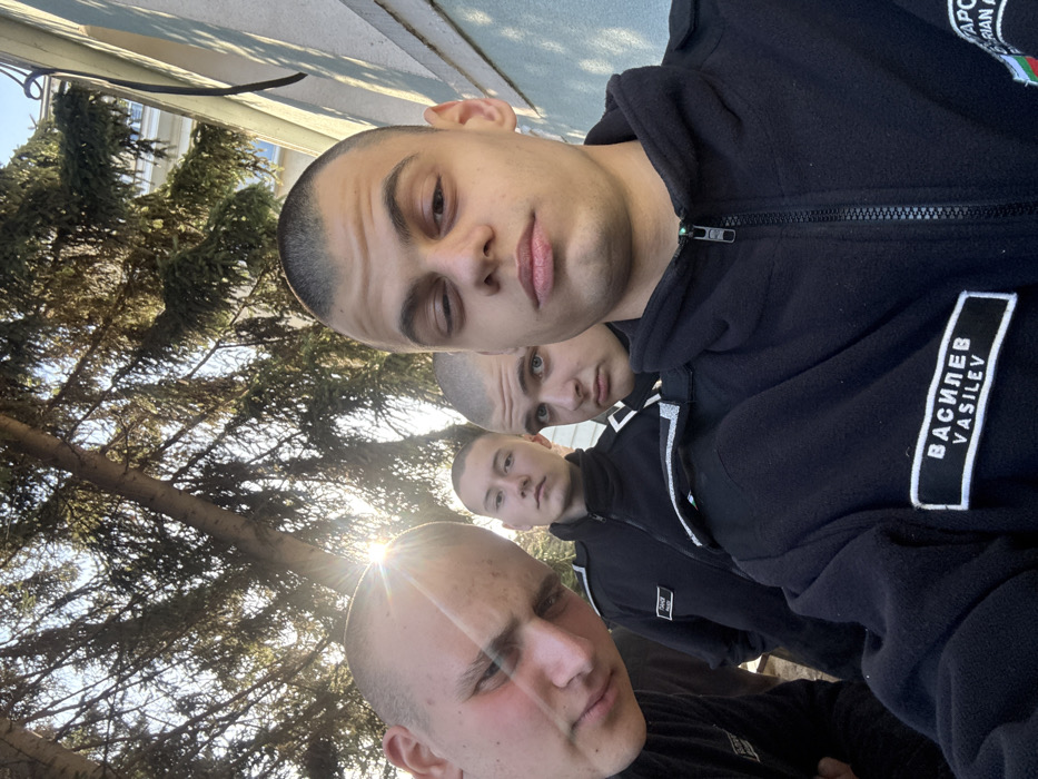 The image displays four young males, all with very short, buzz-cut hairstyles, posing for a close-up selfie outdoors under direct sunlight. They are uniformly dressed in dark, zip-up fleece jackets. The individual in the immediate foreground on the right wears a chest patch labeled "ВАСИЛЕВ VASILEV" in white text on a black background. A shoulder patch on his left arm shows colors consistent with the Bulgarian flag (white, green, red) and partial text strongly indicating "БЪЛГАРСКА ПОЛИЦИЯ" (Bulgarian Police). Another individual behind him, to the left, has a visible name patch reading "ТОМОВ TOMOV". Their expressions are mostly neutral, with the foreground subject on the right exhibiting a slight squint, possibly due to the bright sun which creates a lens flare in the upper left of the frame. The background consists of dense green coniferous tree foliage and a section of a light-colored building with a dark, curved metal fixture attached. Based on the identifiable uniform insignia explicitly referencing the Bulgarian Police, the scene is located in Varna, Bulgaria, likely on the grounds of a police training institution, such as the Police Vocational School "Professor Tsvetan Lazarov".