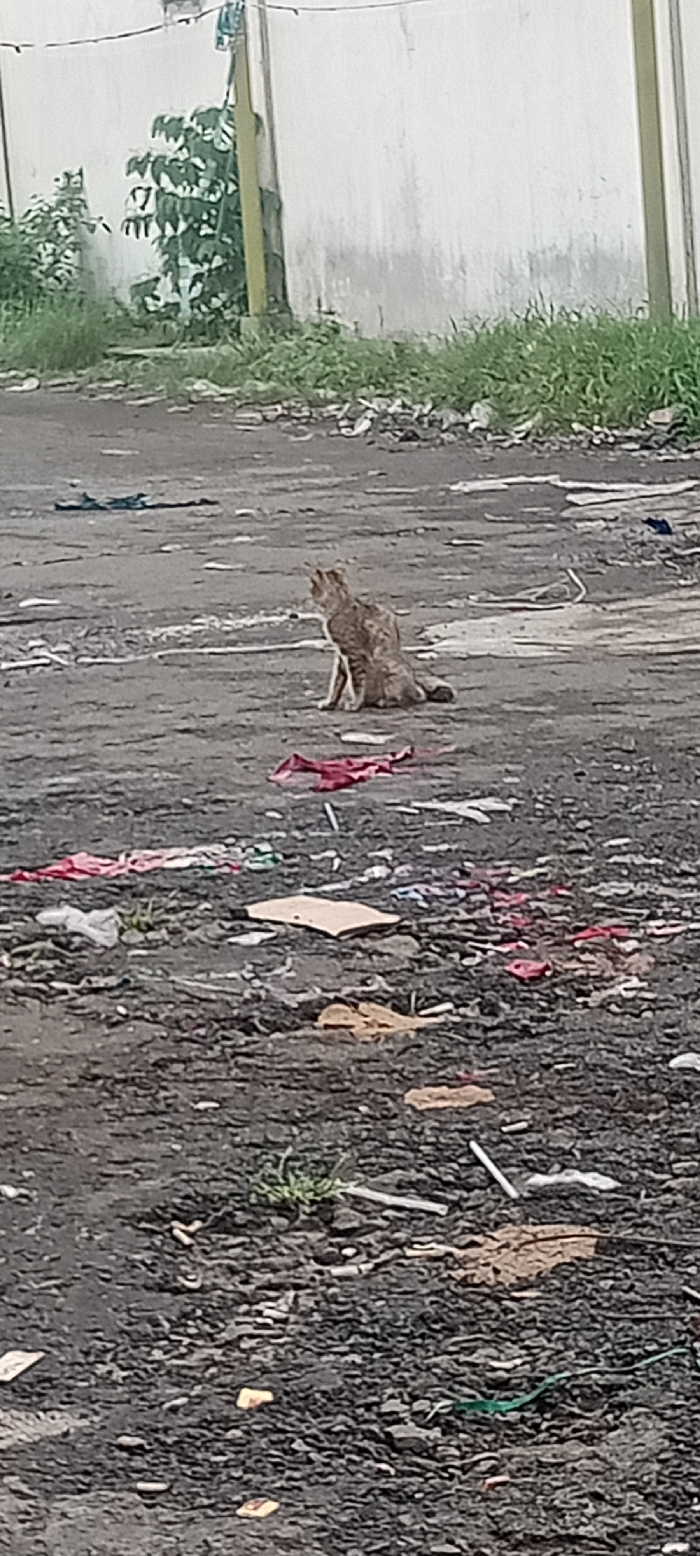 A light brown domestic cat with faint tabby markings is observed sitting upright on its haunches, facing left, on an unpaved, debris-strewn ground in Sulaeman, Indonesia
