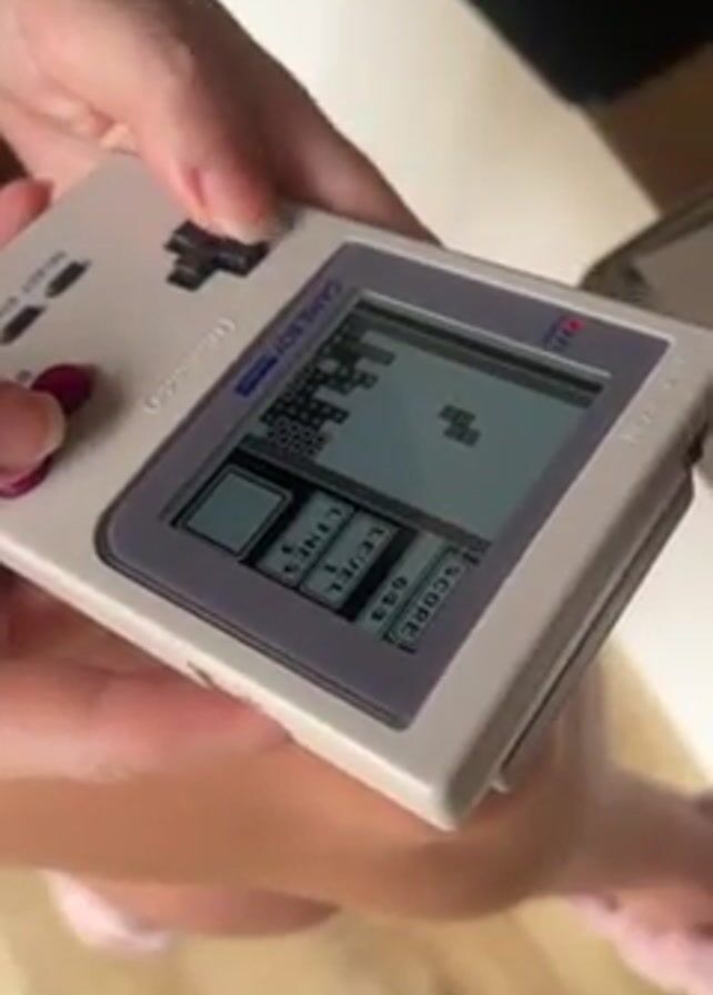 A person is shown playing Tetris on a classic Game Boy handheld console