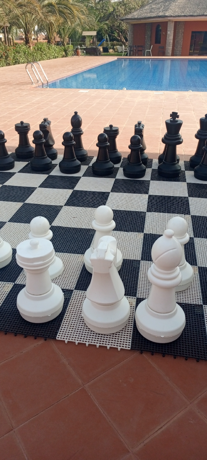 A giant chess set is placed on a checkered board next to a swimming pool. The pieces are large and white, contrasting with the black pieces on the opposite side. In the background, palm trees and a building with a thatched roof are visible, adding to the outdoor ambiance. The chess game is set up on a red-tiled surface.