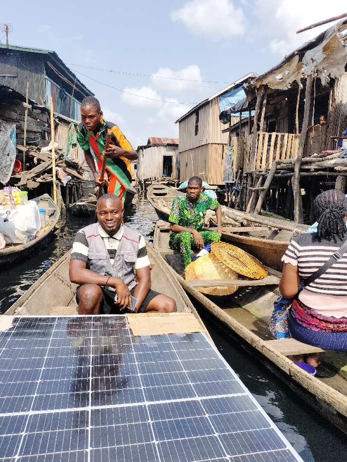 The image depicts a daylight scene in the Makoko community of Lagos, Nigeria, a settlement characterized by wooden stilt houses built over water. Four individuals are present within three traditional wooden canoes on a waterway bordered by the structures. In the immediate foreground, a dark-skinned male, wearing a striped polo shirt and a grey sleeveless vest, is seated in a canoe, smiling directly at the camera. A large rectangular solar panel is positioned horizontally in front of him within the canoe. Behind him, to the left, a second dark-skinned male wearing a multi-colored striped shirt stands in a separate canoe, propelling it with a long wooden pole. To the right, a third dark-skinned male, dressed in a green patterned top and trousers, is seated in another canoe, which also holds two circular woven baskets. Further right and partially obscured, a fourth individual, seen from behind with braided hair and a striped top, occupies a third canoe. The background features numerous, densely packed wooden houses constructed on stilts over the water, displaying varying states of repair, with one featuring a blue tarp. The sky above is clear with scattered white clouds, and the water reflects the sky.