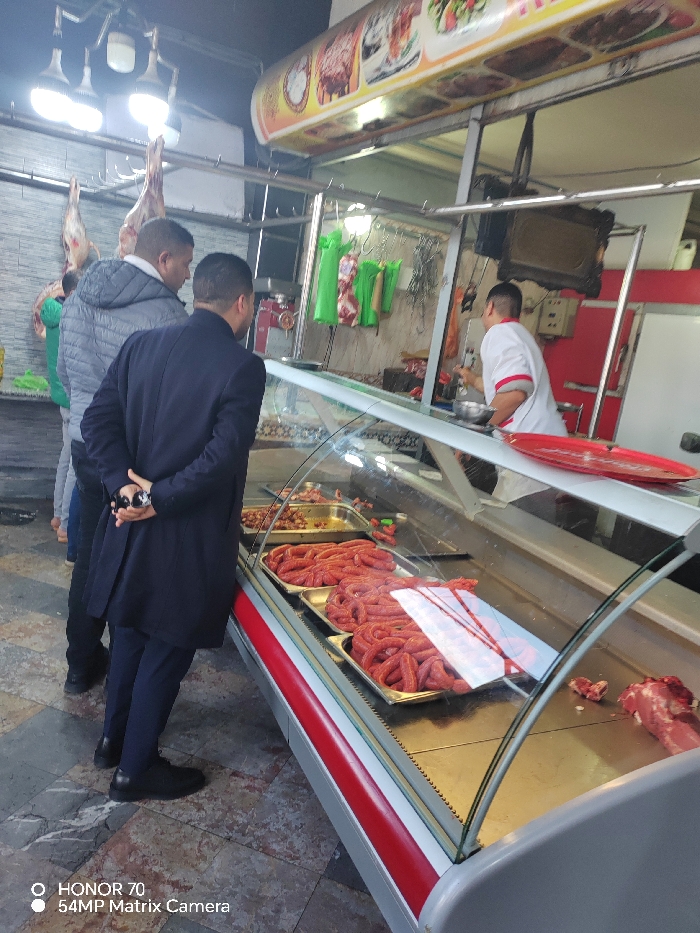 Inside a butcher shop, two men are looking at the meat selection in a display case. The case contains trays of various meats, including sausages and cuts of beef. A butcher in a white coat is behind the counter, preparing something with a metal bowl. Carcasses hang from hooks near the front, and the shop has overhead lighting and signage displaying meat products. The image includes a watermark for the phone's camera.