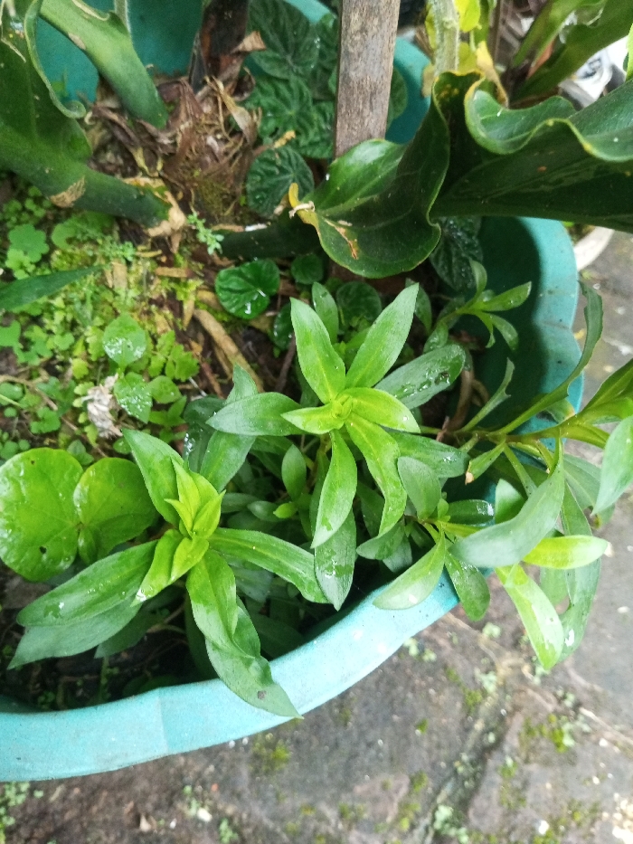 The image displays a close-up, top-down perspective of a plant arrangement within a light teal-colored cylindrical pot. Dominant subjects include multiple clusters of vibrant green plants with elongated, smooth-edged leaves, some bearing visible water droplets, situated in the central and lower portions of the container. Larger, darker green foliage with undulating margins is visible in the upper and right sections, alongside smaller, round-leaved groundcover plants. The substrate appears as dark, moist soil intermixed with dried organic matter, featuring a stout, fibrous stem base in the upper-left and a slender wooden support stake near the top-center. The pot rests on an exterior, grey-toned paved surface, which exhibits incidental moss and small plant growth in the lower-right quadrant. No individuals, specific actions, or interactions are depicted. The scene is illuminated by ambient daylight. The visual content does not provide information to confirm a specific location within Pandaria, India.
