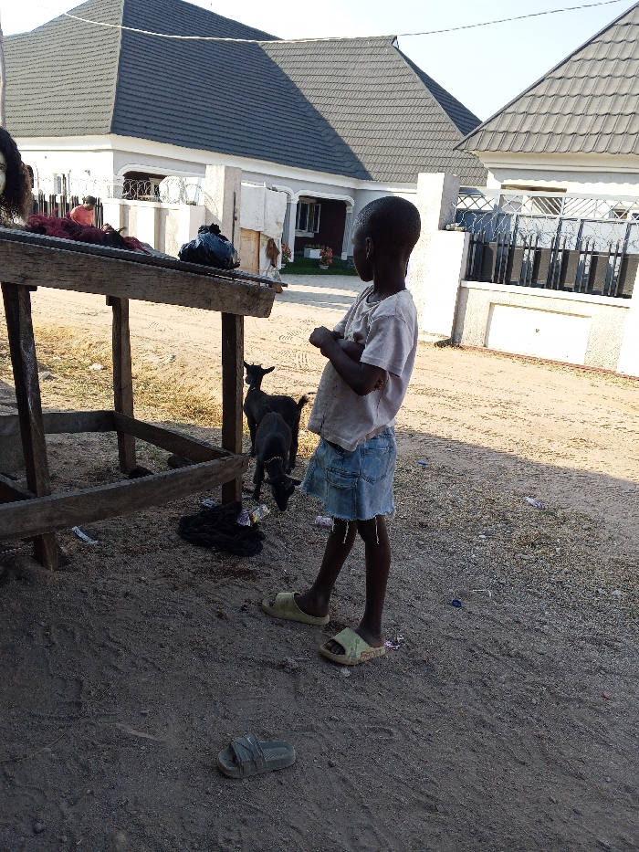 - "An outdoor scene in Adonkolo, Nigeria, depicts a young individual and two goats in a residential area" by FM-XS7TG3, licensed under CC BY 4.0