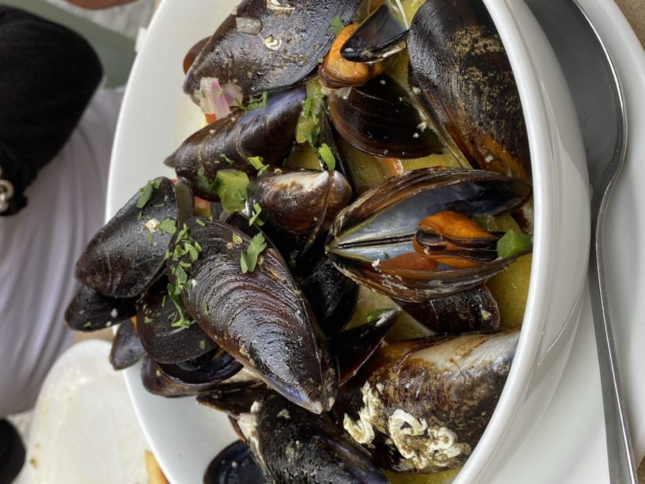 - "A close-up view depicts a large white ceramic bowl filled with cooked mussels in a yellowish, creamy broth, garnished with chopped green herbs" by FM-1GLuK2, licensed under CC BY 4.0
