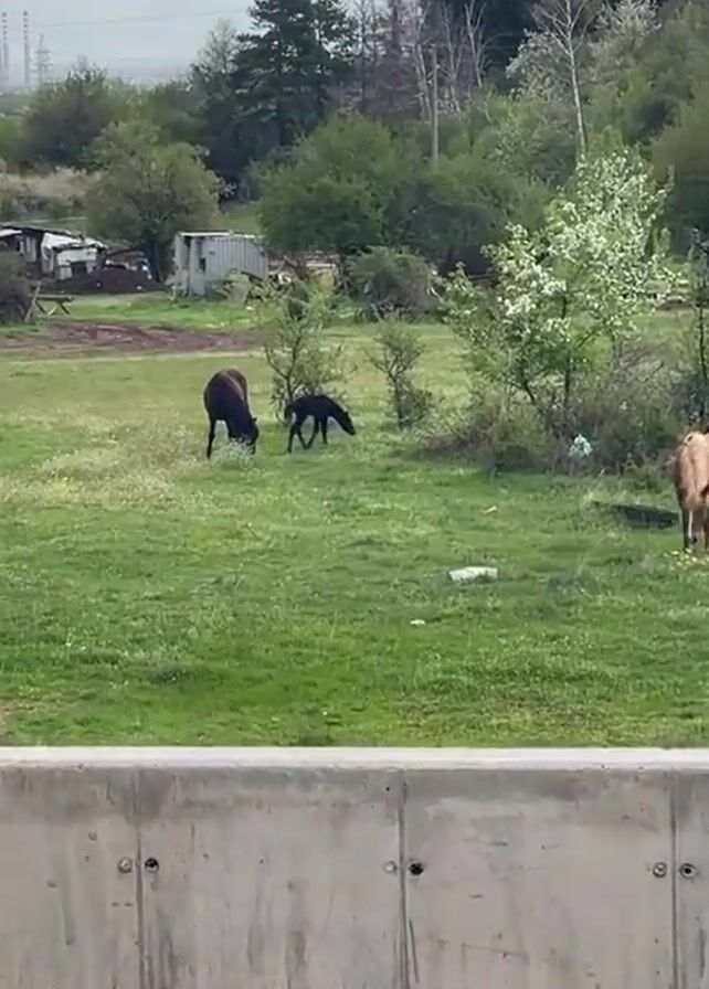 green field with several horses grazing in it. Two horses are dark brown or black, one is chestnut, and one is white. The field is surrounded by trees and shrubs, and there is a grey concrete wall in the foreground. In the background there is a small shed-like structure, some industrial structures, and a power line. The weather is cloudy. At the end of the video, a dark colored car is visible in the foreground. A dumpster is also in the foreground.
